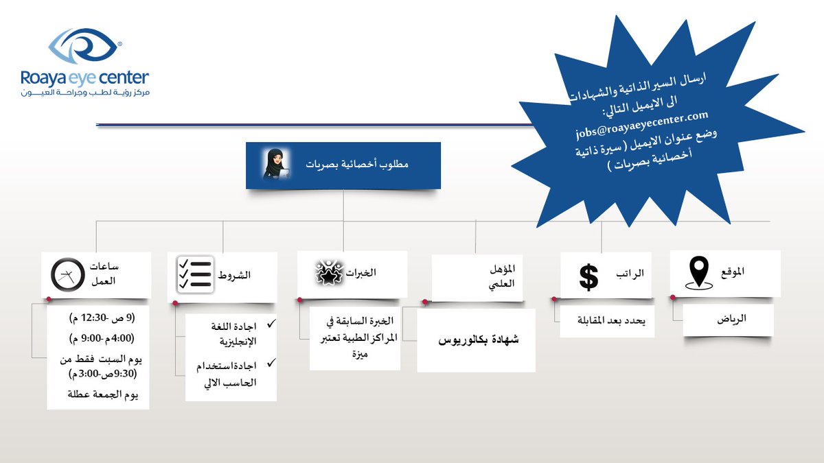 للعمل بالمركز بمسمى (أخصائية بصريات)، لحملة البكالوريوس في التخصص